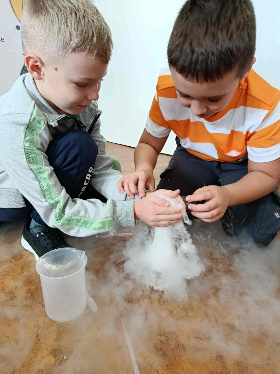 Dwóch chłopców z uśmiechem bada efekt wydobywającej się mgły nad naczyniem podczas doświadczenia chemicznego, zdjęcie 1 z 5