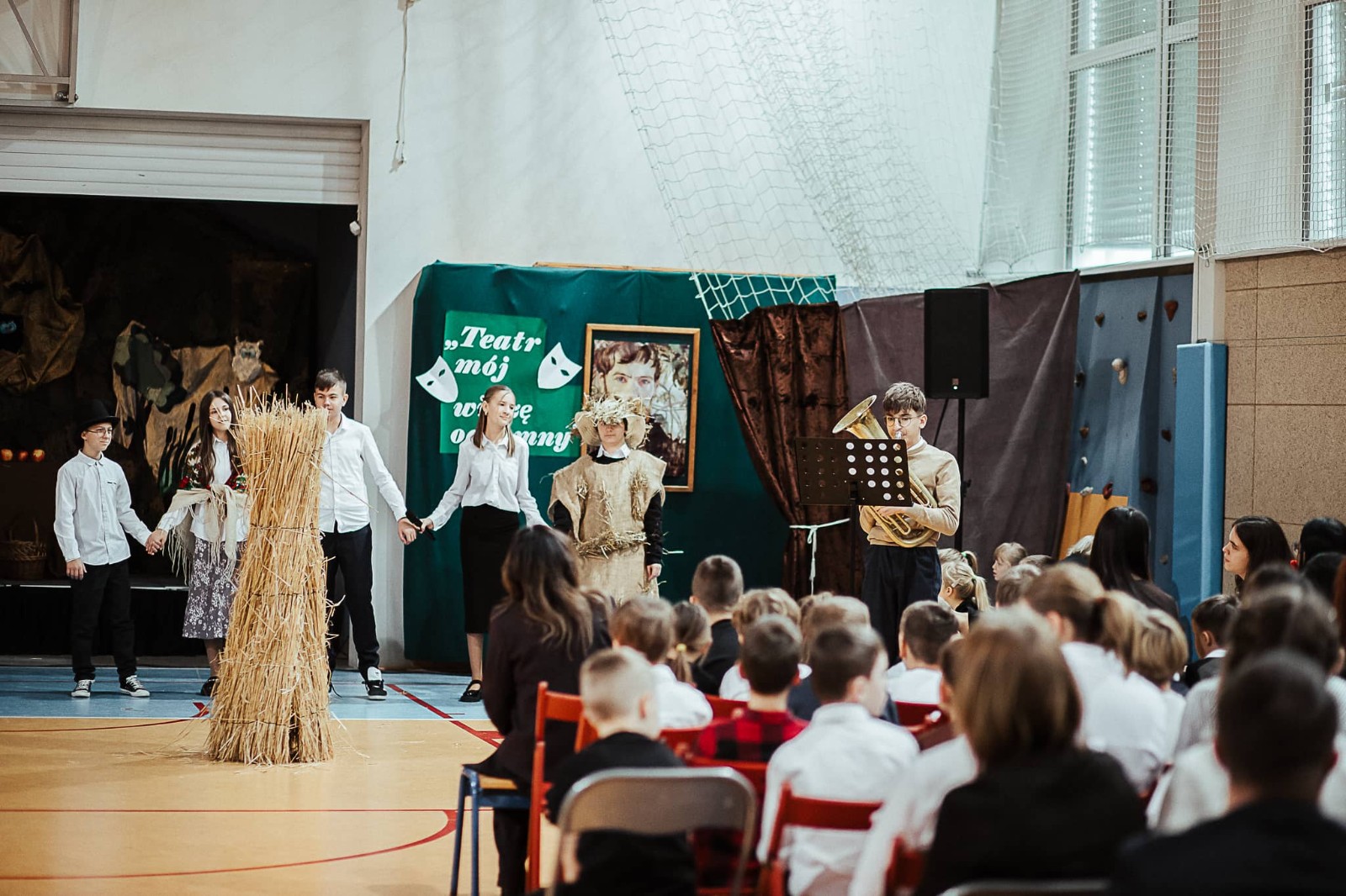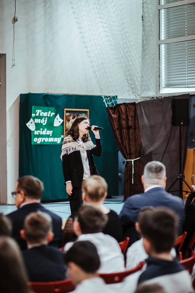 W czasie inscenizacji, w której pokazano, co łączy Adama Mickiewicza i Stanisława Wyspiańskiego, zostały przedstawione najważniejsze informacje o tym znakomitym malarzu i poecie. Dowiedzieliśmy się, jak wyglądało jego dzieciństwo i lata szkolne. Zobaczyliśmy też reprodukcje namalowanych przez Wyspiańskiego obrazów. To właśnie w nawiązaniu do malowanych przez niego motywów roślinnych uczennica klasy IIA PDP znakomicie wykonała piosenkę Kwiaty polskie.