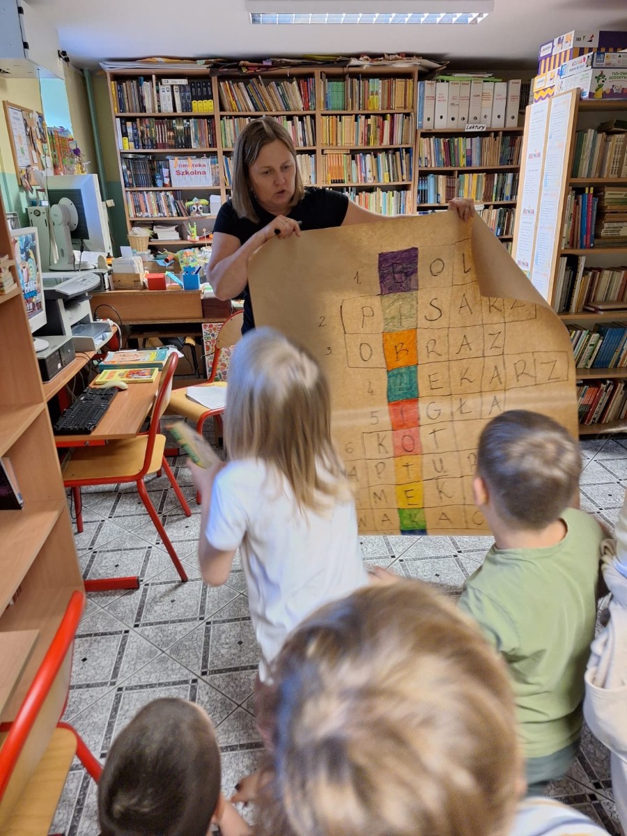 Pierwszoklasiści zaznajomili się z regulaminem biblioteki, zasadami wypożyczania i poszanowania książek, rozwiązywali zagadki czytelnicze i krzyżówkę. Na przygotowanej planszy przyczepili „prośby książki”, tak aby każdy uczeń wiedział, jak należy o nie dbać.