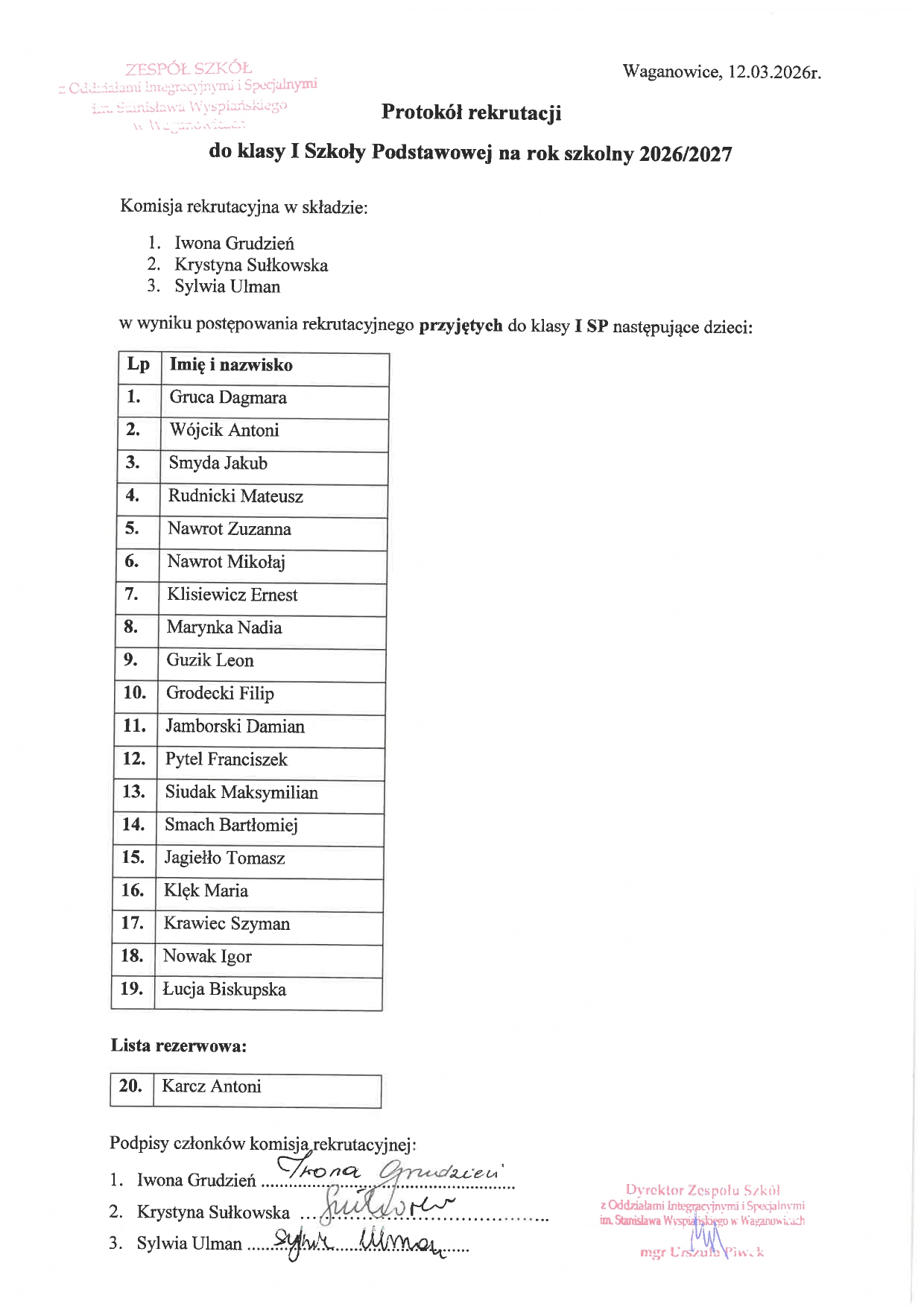 Potwierdzenie woli przyjęcia ucznia do naszej szkoły należy złożyć do dnia 20 marca 2026 r. osobiście w sekretariacie szkoły lub za pośrednictwem poczty elektronicznej.